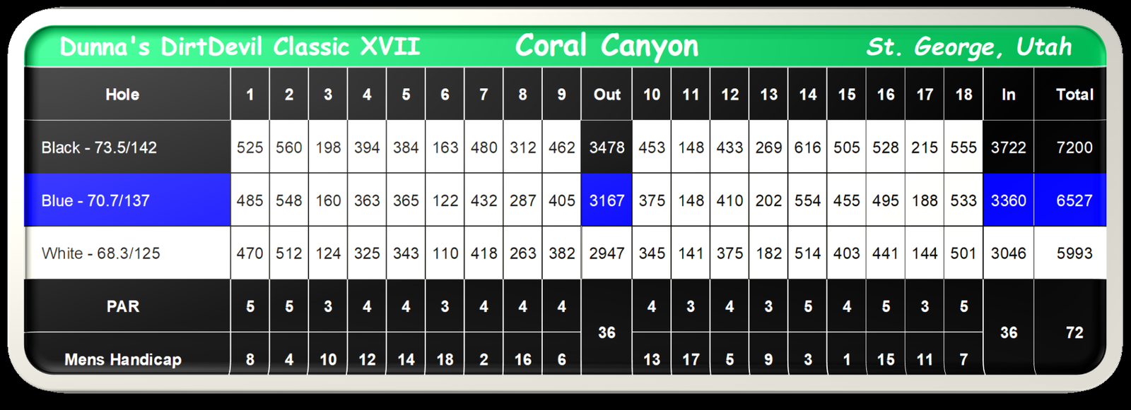 Monday, June 1st - 8:00 AM Shotgun Start (Mesquite Time!) Coral Canyon Golf Course - Washington, Utah (Scorecard) -